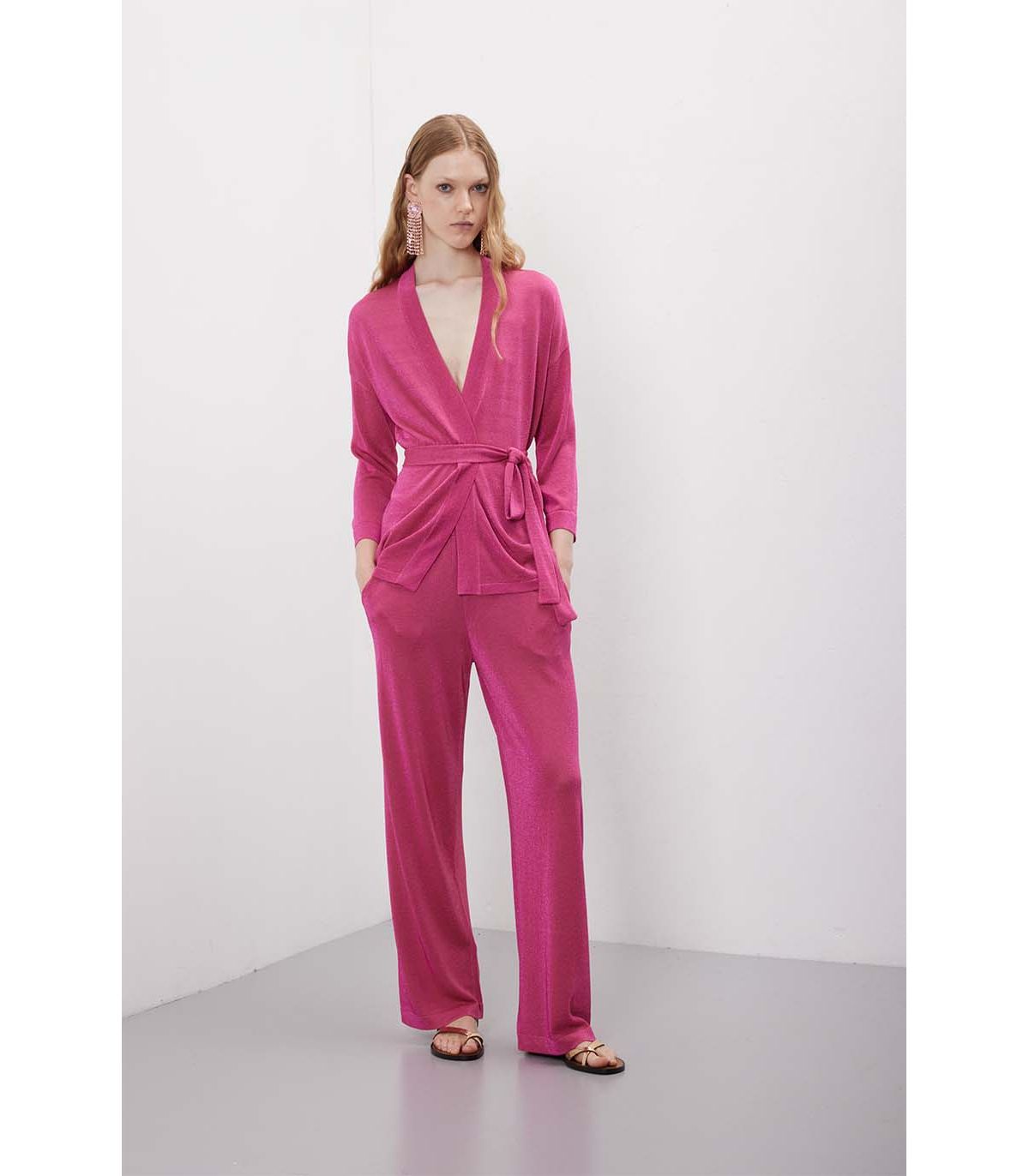 Linea fluida che accompagna il movimento con naturalezza. La fantasia Unita valorizza la luce discreta del lurex, aggiungendo brillantezza senza eccessi. Equilibrati e contemporanei, definiscono la silhouette con semplicità e leggerezza.