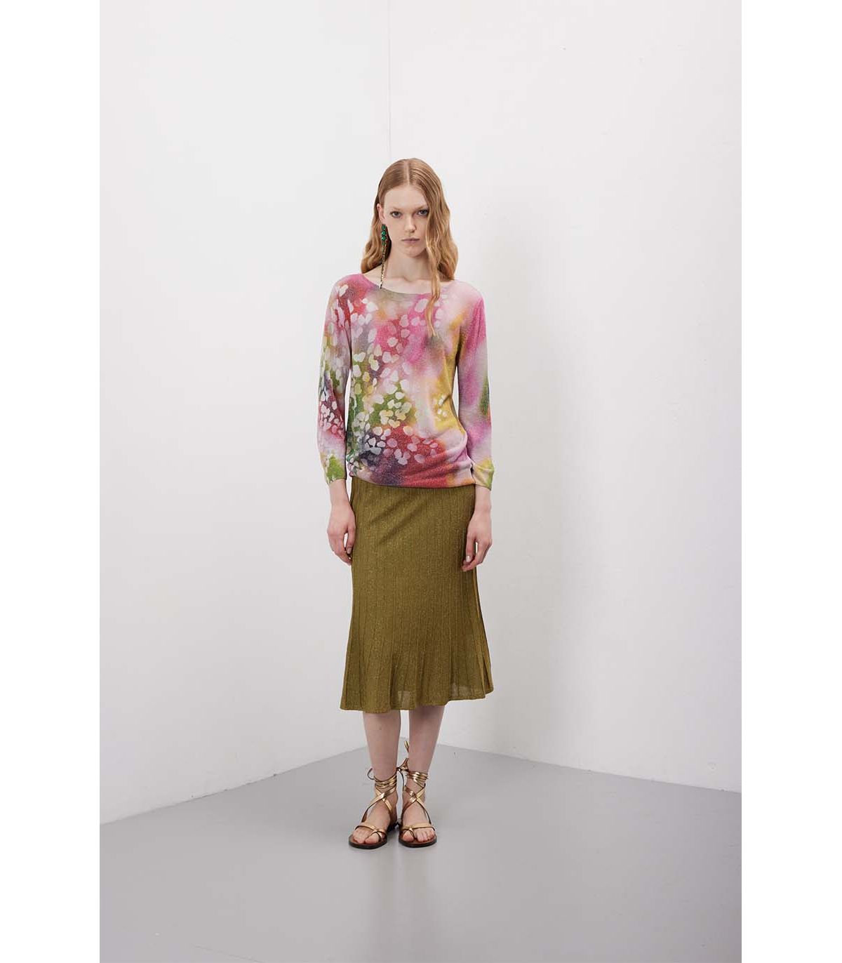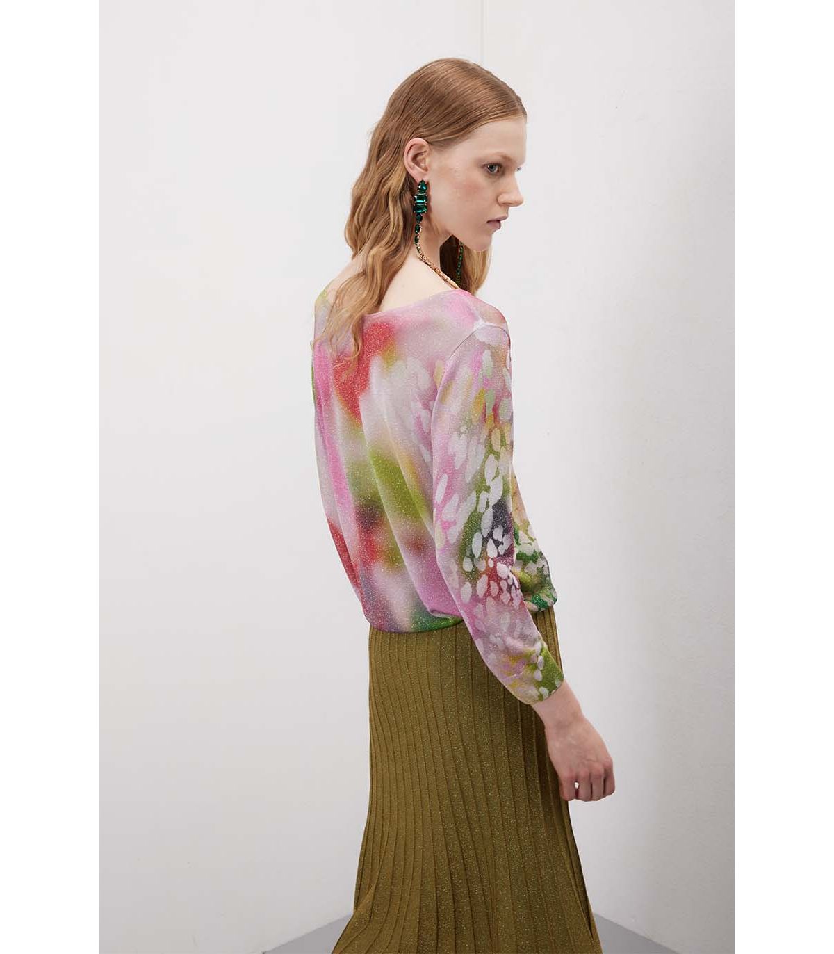 Una linea pulita che lascia spazio al colore. L’effetto shaded scorre sulla superficie con transizioni morbide, mentre il lurex intercetta la luce creando profondità discreta. La costruzione è leggera ma definita, pensata per accompagnare il movimento senza rigidità. Double use: fronte e retro intercambiabili per cambiare interpretazione con naturalezza.