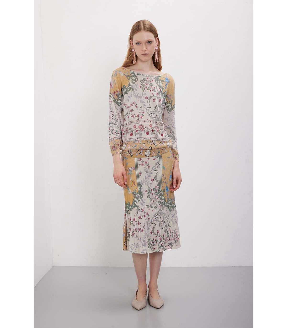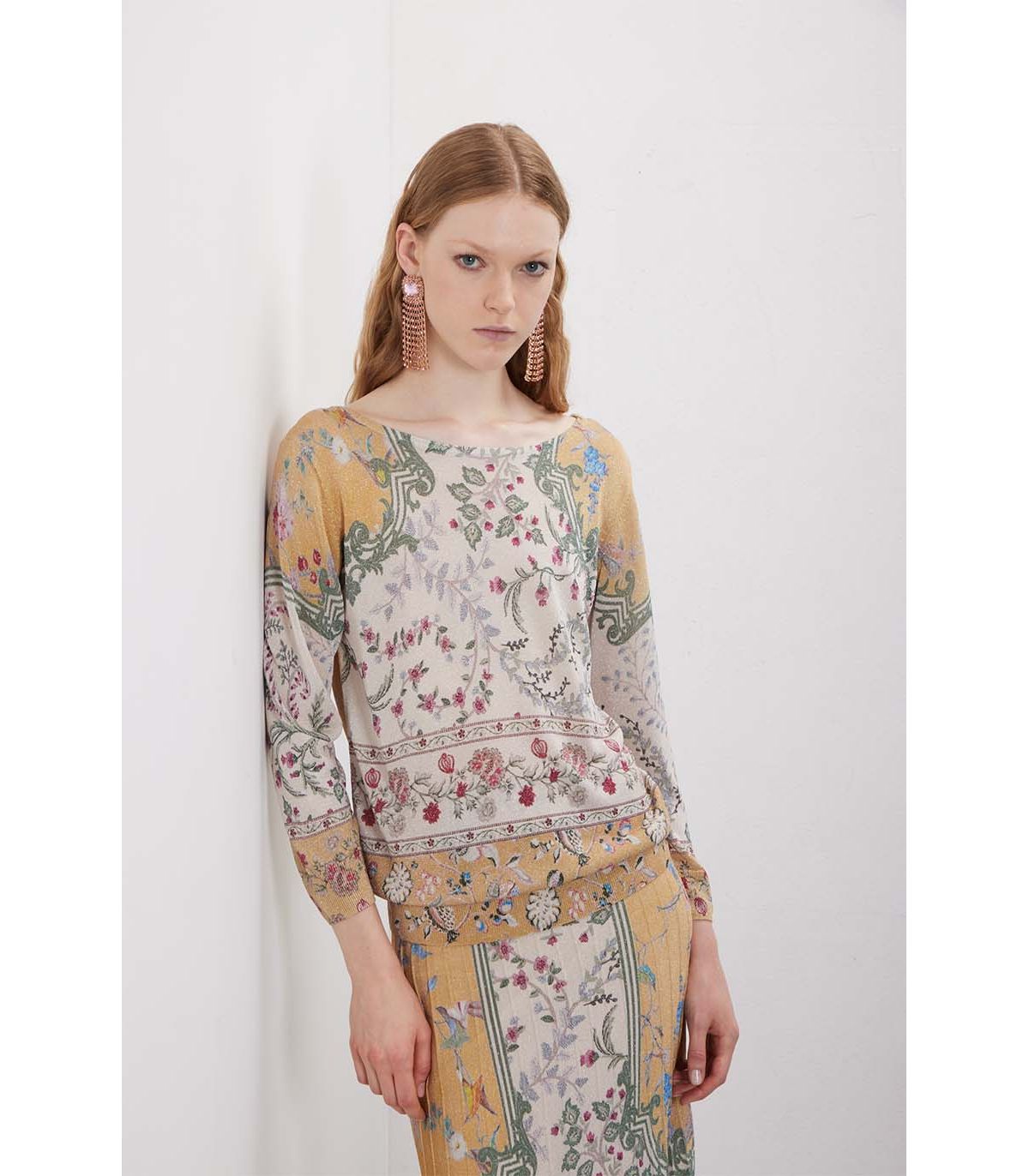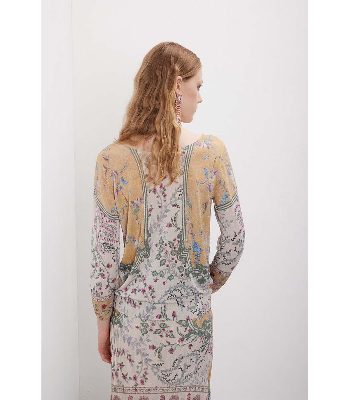 Manica 3/4 e proporzioni equilibrate definiscono una linea versatile. Il pattern all-over crea ritmo visivo senza appesantire la silhouette. La viscosa con lurex dona fluidità e una luminosità discreta, mantenendo la superficie leggera e contemporanea. Pensata per uno stile rilassato ed essenziale.