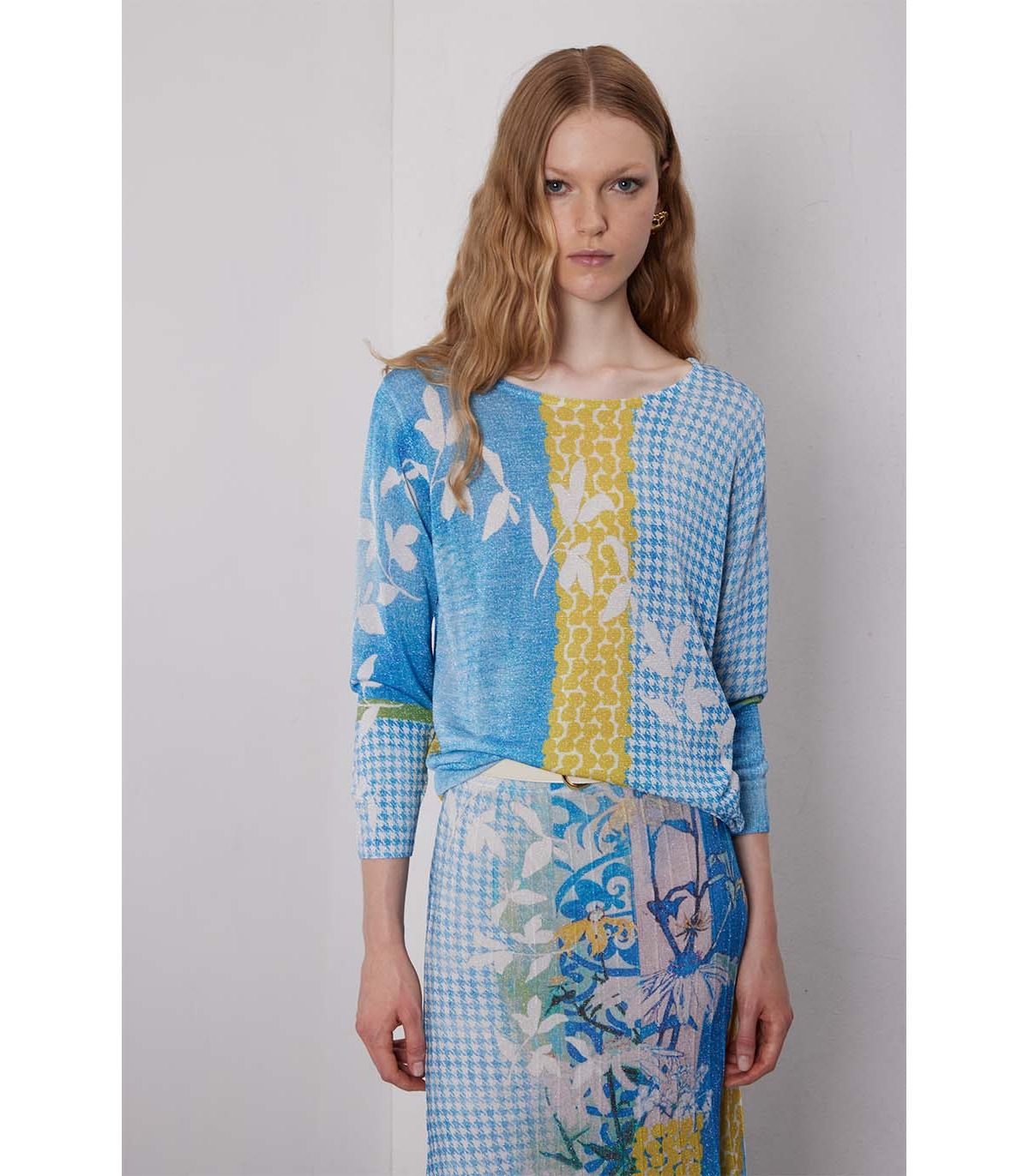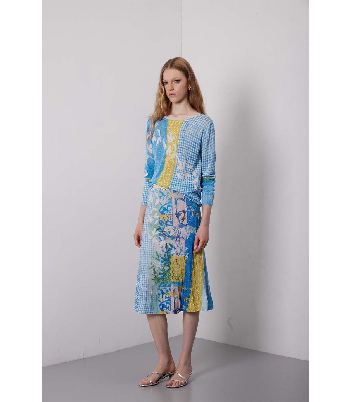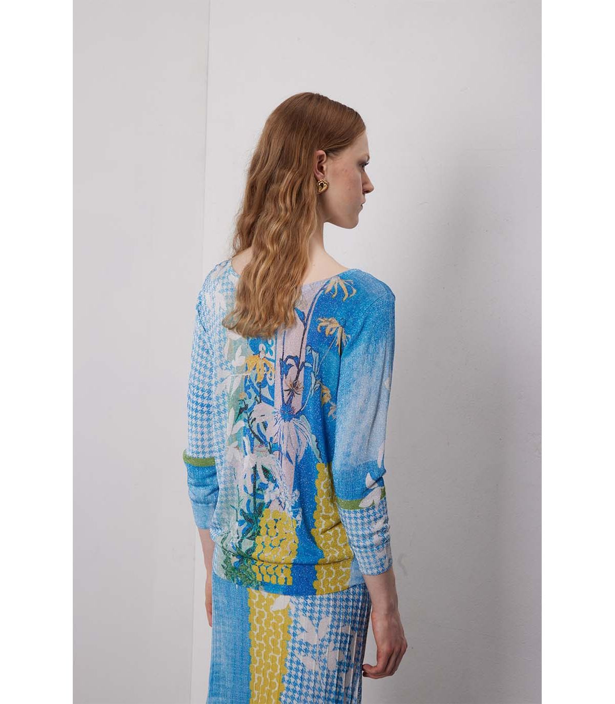 Il girocollo apre la linea con leggerezza. La stampa Delavè non è solo colore, è atmosfera. La viscosa con lurex accompagna il corpo con fluidità naturale, aggiungendo un tocco luminoso discreto. Un modello essenziale, ma con una presenza silenziosa e raffinata.