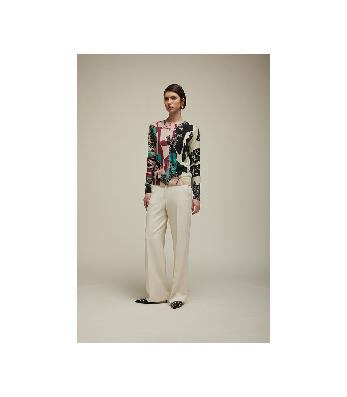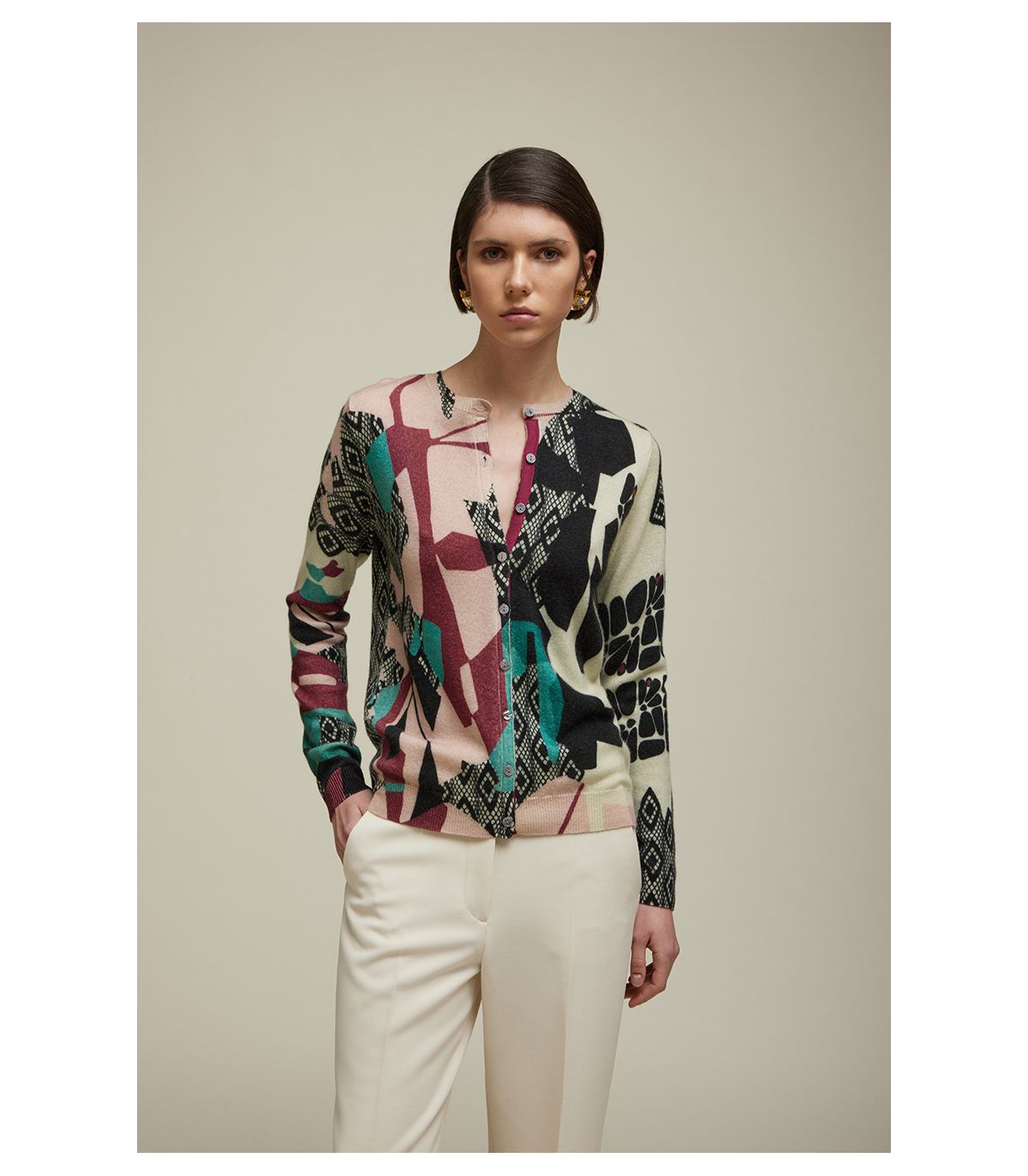 Un cardigan che unisce pregio e versatilità. Realizzato in puro cashmere, con girocollo e maniche lunghe, conquista per la sua morbidezza e raffinatezza. La Stampa Lace, riprodotta in digitale, regala un effetto sofisticato e femminile. Il design Double Use permette di indossare il capo fronte/retro, con motivi differenti, e l’abbottonatura reversibile offre un’ulteriore possibilità di styling, davanti o dietro. Con la sua vestibilità regolare, è un alleato elegante e trasformabile per molteplici look.