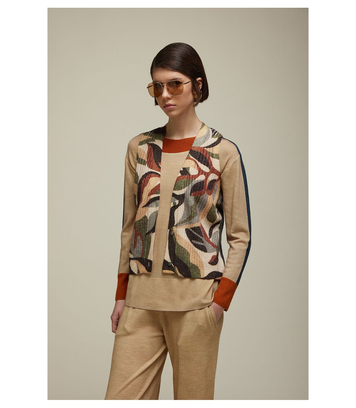 Un gilet leggero ma di carattere, ideale per dare un tocco distintivo a qualsiasi outfit. In misto alpaca e lana, con scollo a V e abbottonatura centrale, è facile da indossare e da abbinare. La Stampa Camouflage digitale aggiunge energia e modernità, trasformandolo in un capo versatile: perfetto sopra una camicia per uno styling più definito o su una t-shirt per un look rilassato e cool. La vestibilità regolare assicura comfort e praticità in ogni occasione.