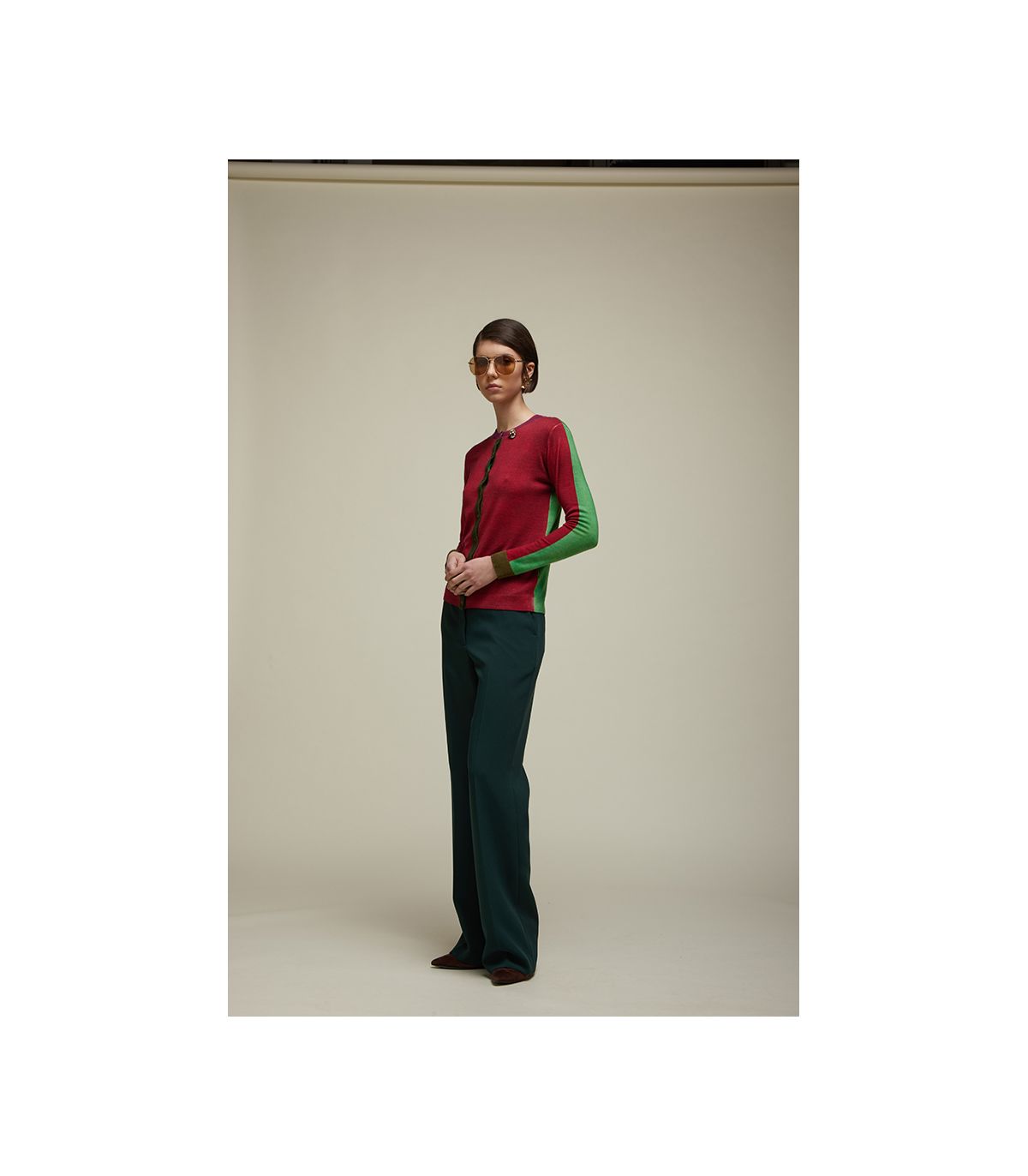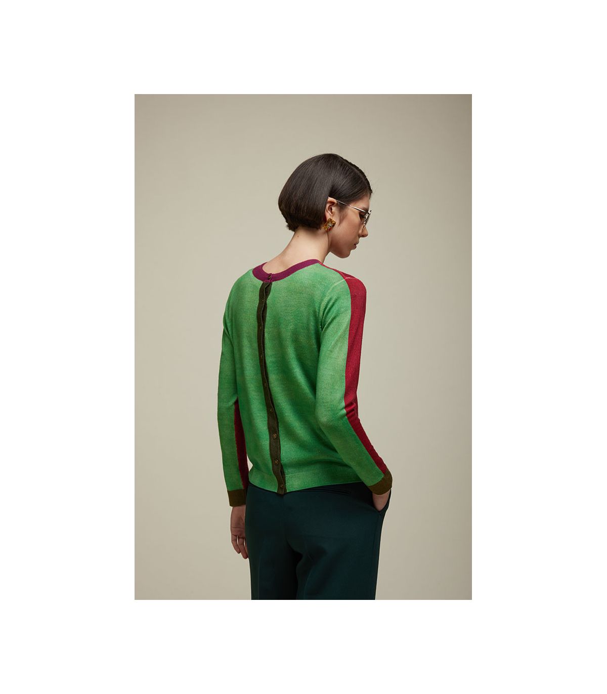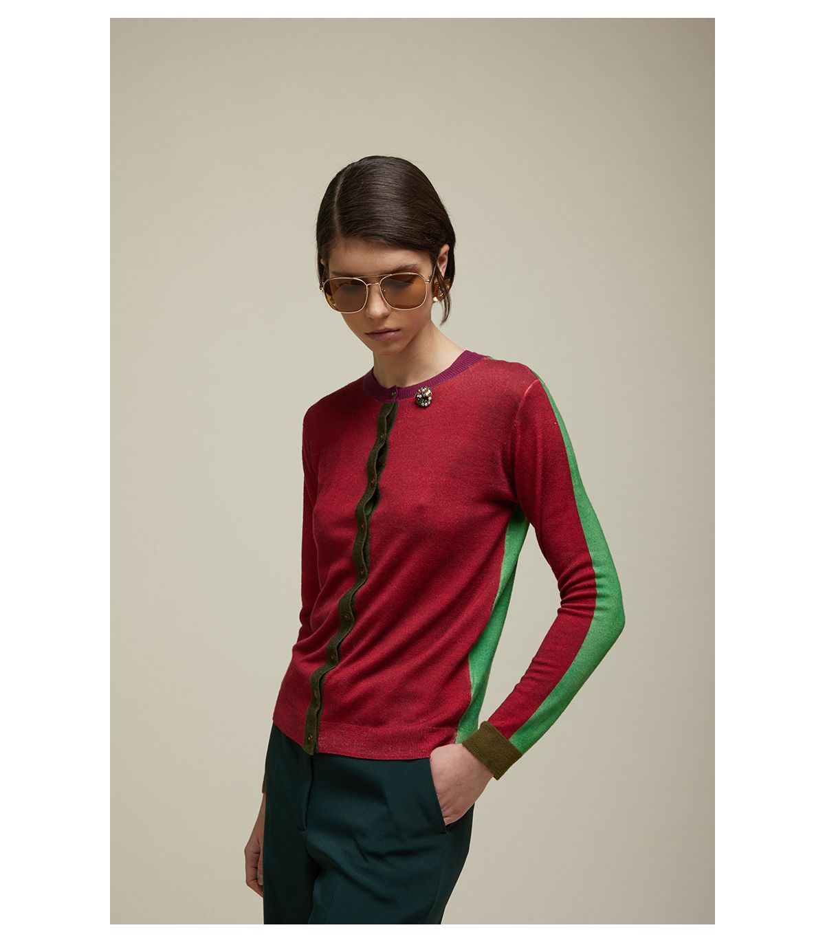 Cardigan girocollo in 100% Lana Merino Extrafine, soffice e confortevole, con Maniche Lunghe. Il design Double Use permette di indossarlo Fronte o Retro, rivelando due varianti della Stampa Digitale Falso Unito Bicolore. Le rifiniture a contrasto e la Spilla Decorativa arricchiscono il capo con dettagli sofisticati. La Vestibilità Regolare lo rende perfetto per look versatili e moderni.