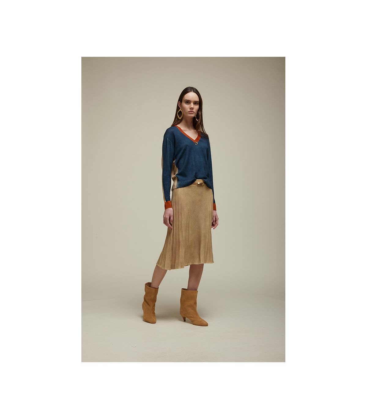 Pull in 100% Lana Merino Extrafine, soffice e avvolgente, con Scollo a V, Maniche Lunghe e linea Oversize Cropped. La Stampa Digitale Falso Unito Bicolore regala un effetto grafico raffinato e contemporaneo, mentre la spilla decorativa aggiunge un dettaglio ricercato. Un capo moderno e versatile, perfetto per interpretare la maglieria con personalità.