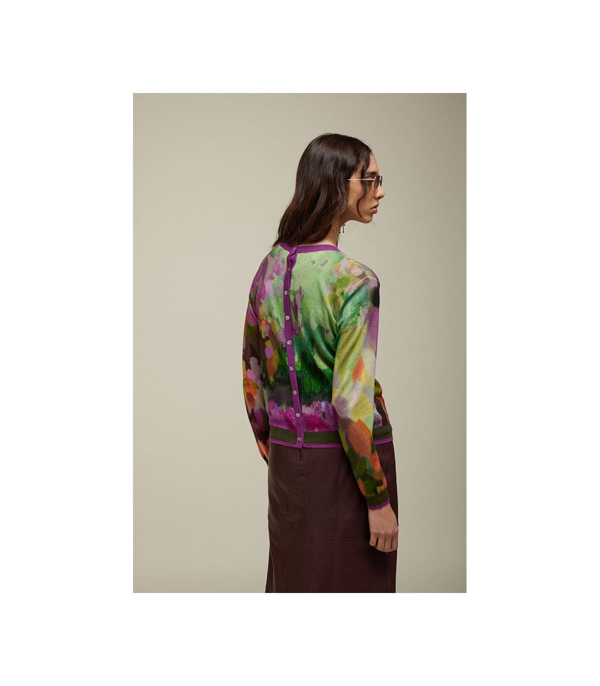 Cardigan in 100% lana merino extrafine, morbido e avvolgente, con scollo girocollo, maniche lunghe e bordi a contrasto. Il design Double Use permette di indossarlo fronte o retro, rivelando due varianti della stampa digitale variopinta, luminosa e dinamica. Con la sua vestibilità regolare e l’abbottonatura su entrambi i lati, è un capo originale e versatile che dona energia e personalità al guardaroba.