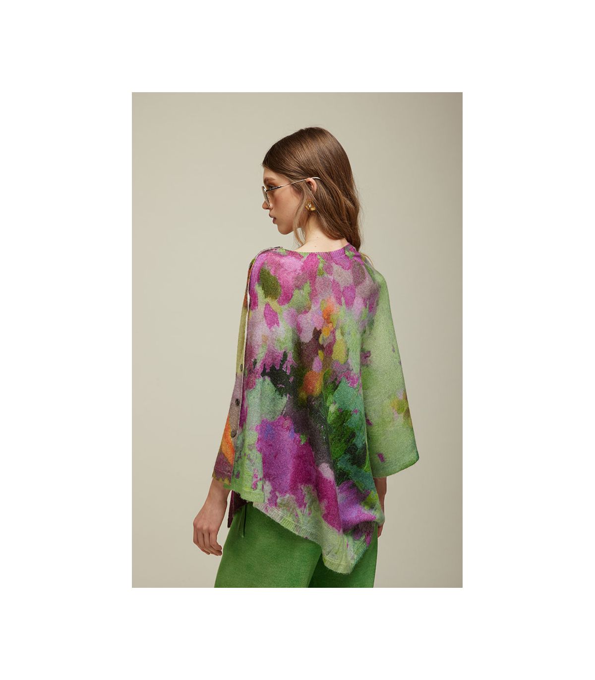 Poncho girocollo in misto alpaca e lana, caldo e avvolgente, con abbottonatura su un lato che ne sottolinea la linea morbida. Il design Double Use permette di indossarlo fronte o retro, rivelando due varianti della stampa digitale variopinta, luminosa e dinamica. Un capo versatile e cool, perfetto per aggiungere energia e colore ai look di stagione.