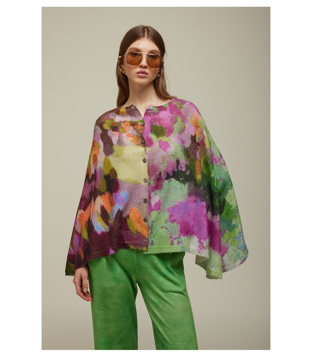 Poncho reversibile con doppia stampa digitale variopinta e abbottonatura laterale