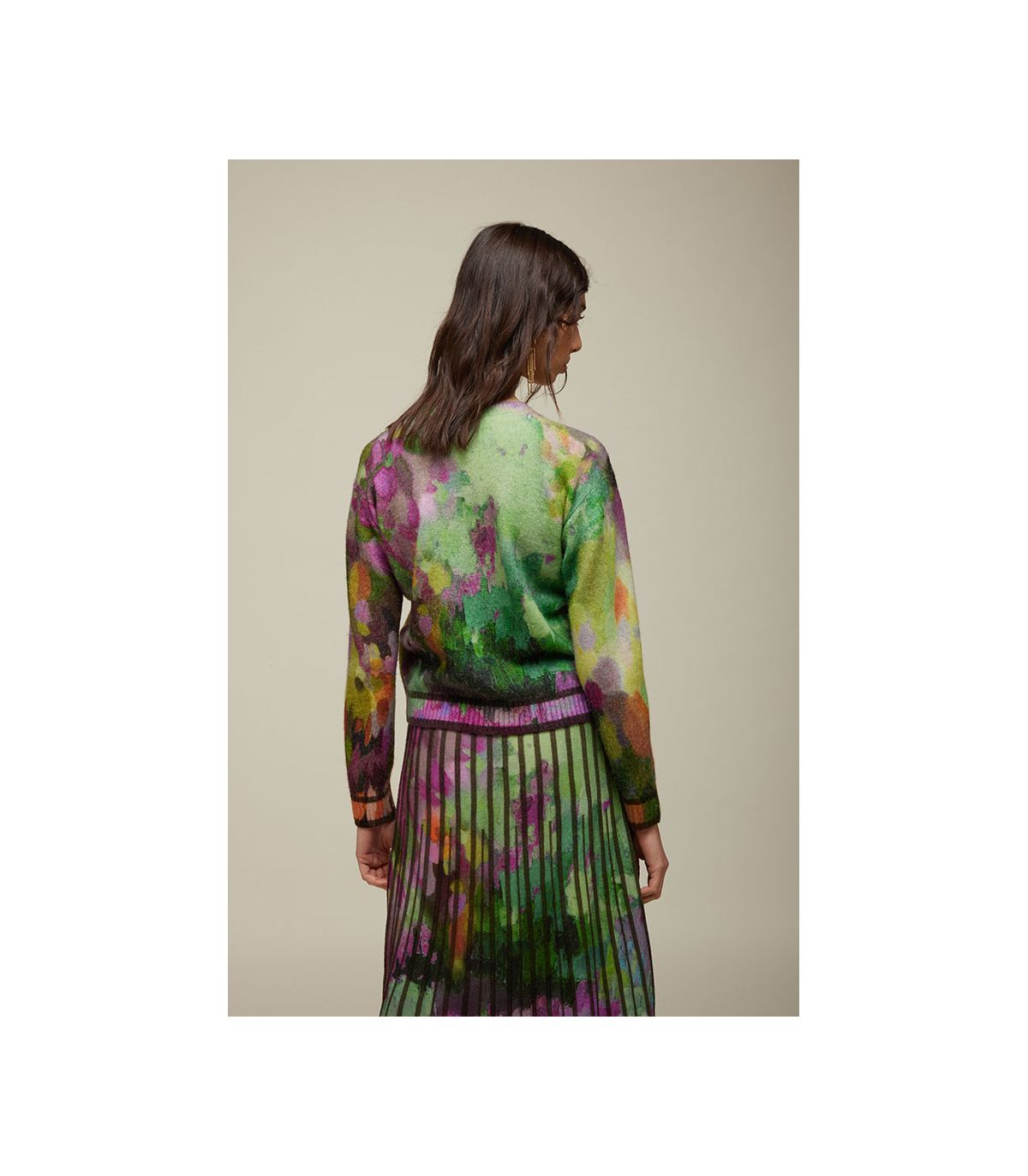 Gonna lunga in 100% lana merino extrafine, leggera e fluida, con lavorazione plissé che dona movimento. Il design Double Use propone due varianti della stampa digitale Variopinta, fronte e retro, per cambiare look con un solo gesto. Il cinturino elastico in vita e la vestibilità regolare la rendono un capo pratico e cool, perfetto per dare energia e colore alla stagione.
