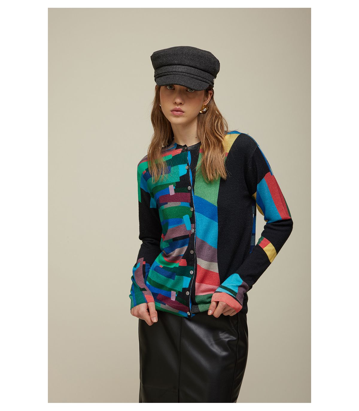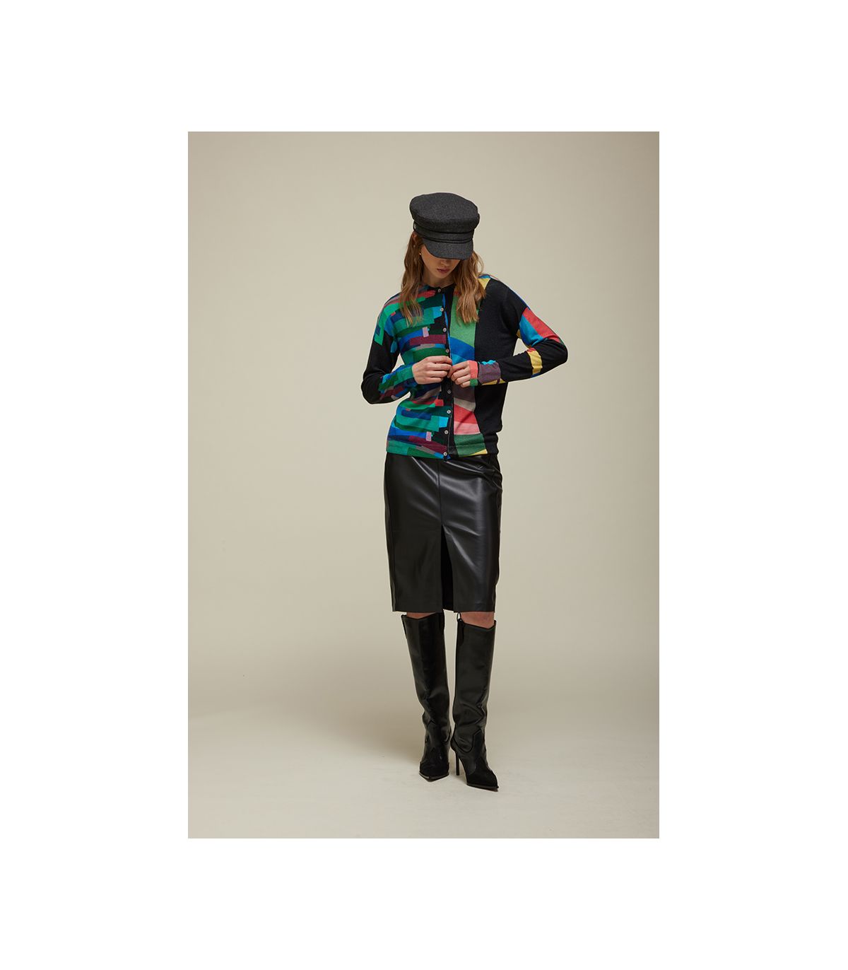 Cardigan in 100% lana merino extrafine, soffice e avvolgente, con scollo girocollo e maniche lunghe. Il design Double Use permette di indossarlo fronte o retro, con due varianti della fantasia digitale Pop e abbottonatura su entrambi i lati. Un modello dalla vestibilità regolare, pensato per aggiungere colore e vivacità al guardaroba.