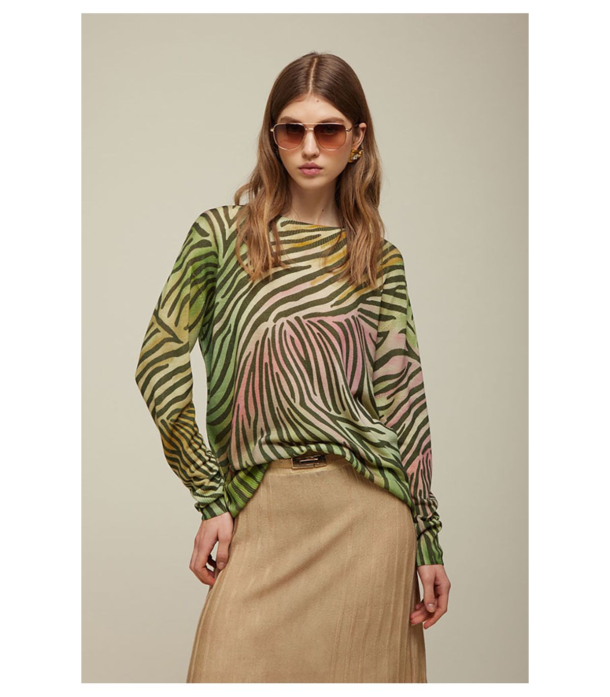 Maglia in 100% lana merino extrafine, morbida e avvolgente, con scollo a barca e maniche lunghe. Il design Double Use svela due interpretazioni della fantasia digitale Zebra, fronte e retro, per cambiare stile con un solo gesto. La vestibilità oversize regala comfort e un’attitudine contemporanea, trasformando la maglieria in un capo moda versatile.