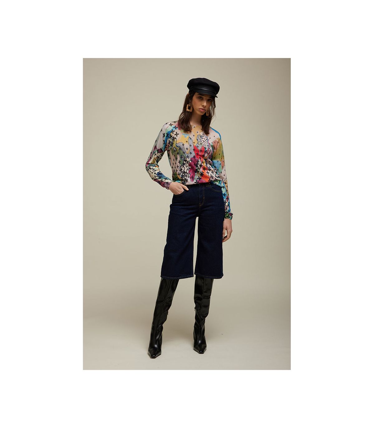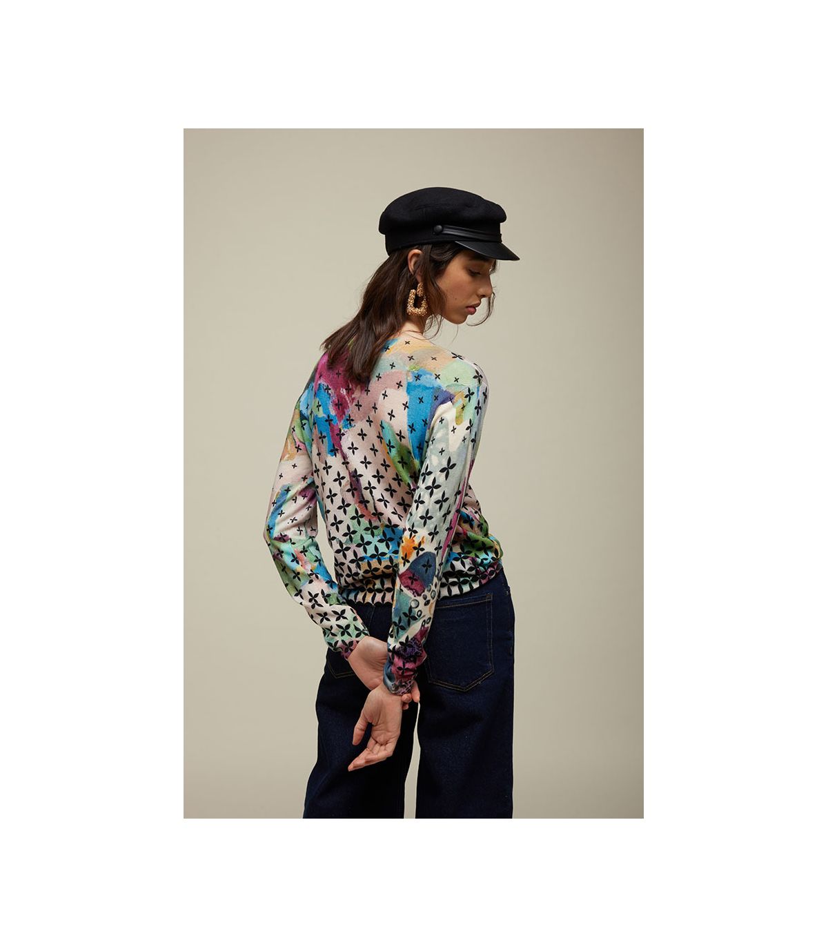 Un capo che ridefinisce l’idea di maglia in lana merino: soffice, leggero e versatile. Il design Double Use permette di indossare il pull fronte o retro, grazie alla fantasia Art stampata digitalmente. Perfetto per la stagione FW, dona personalità a ogni look.