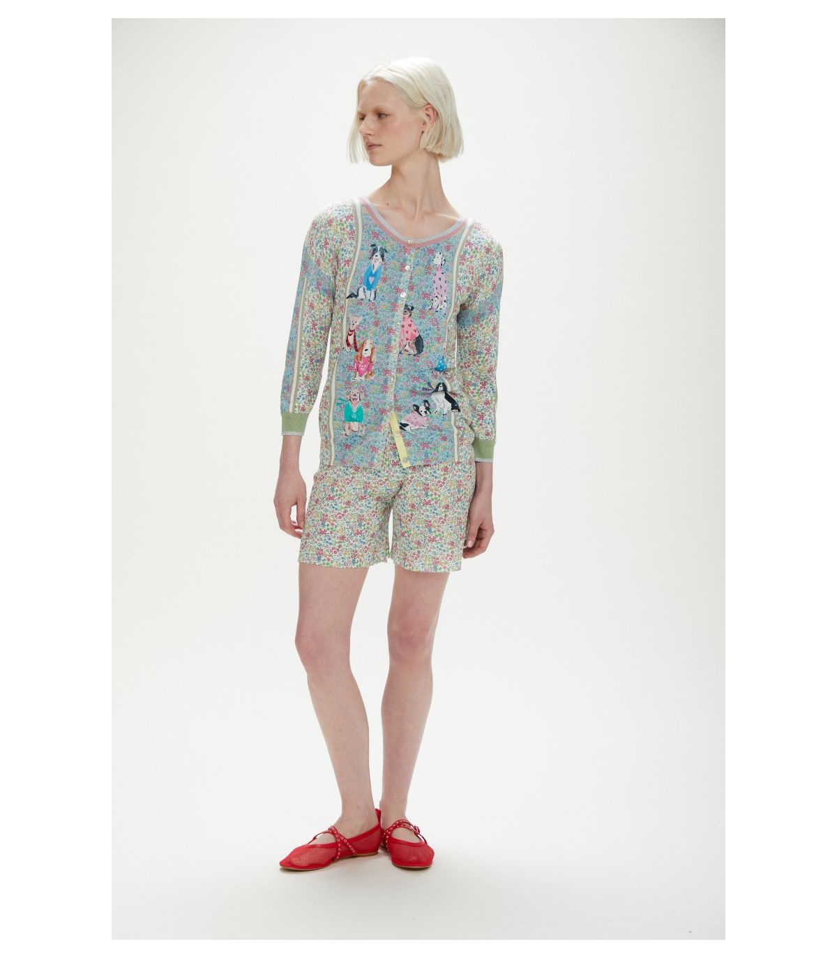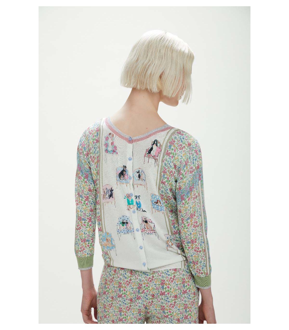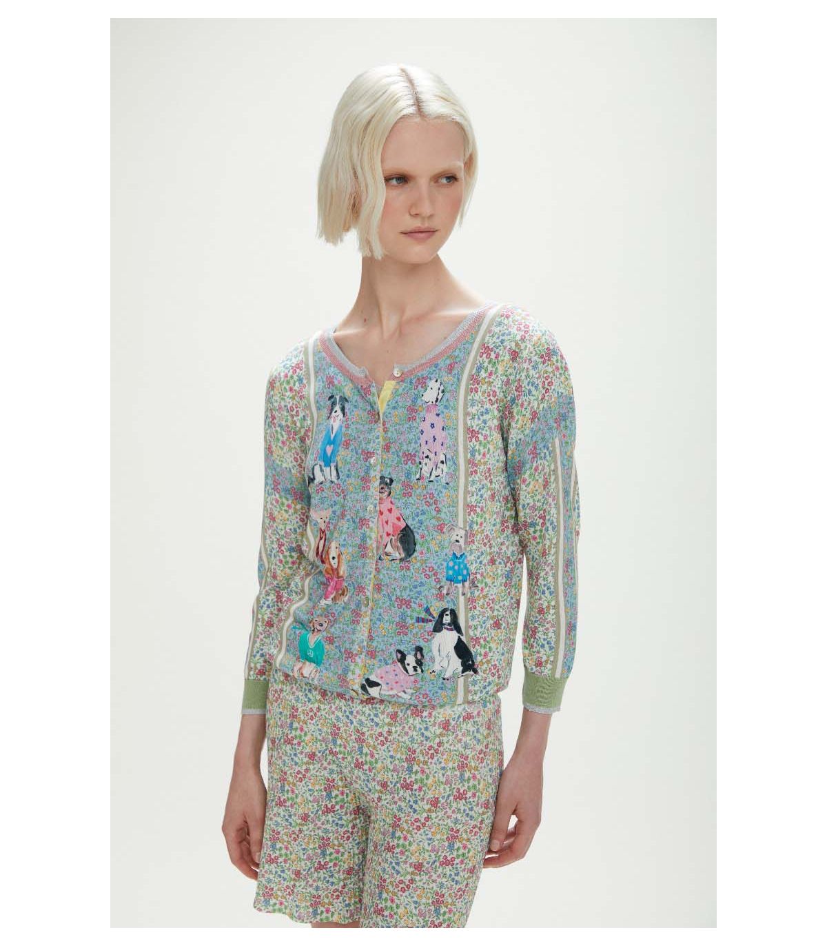 Un incontro di dolcezza e vivacità, questo cardigan con manica 3/4 è impreziosito da una stampa digitale Dogs&Flowers, che mescola la freschezza dei fiori con l'irresistibile fascino dei cani. Il design double use permette di indossarlo in due modi diversi, grazie alla sua stampa intercambiabile sul davanti e sul dietro, per una versatilità senza pari. La doppia abbottonatura aggiunge un tocco di eleganza discreta.