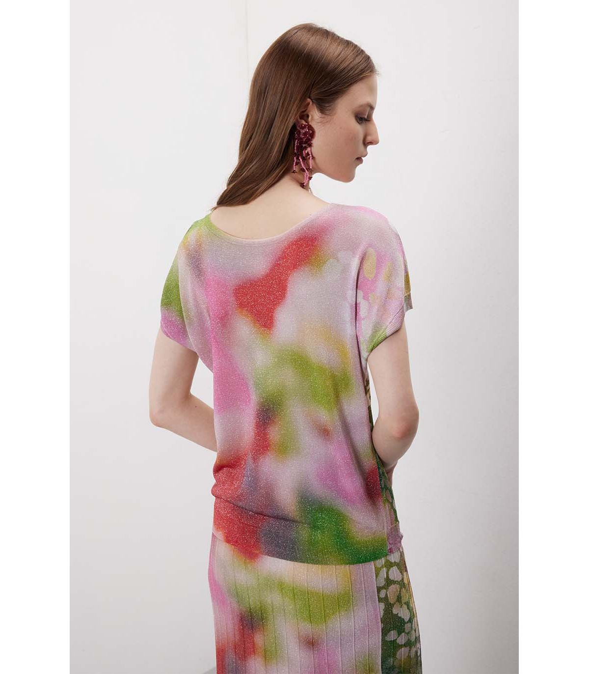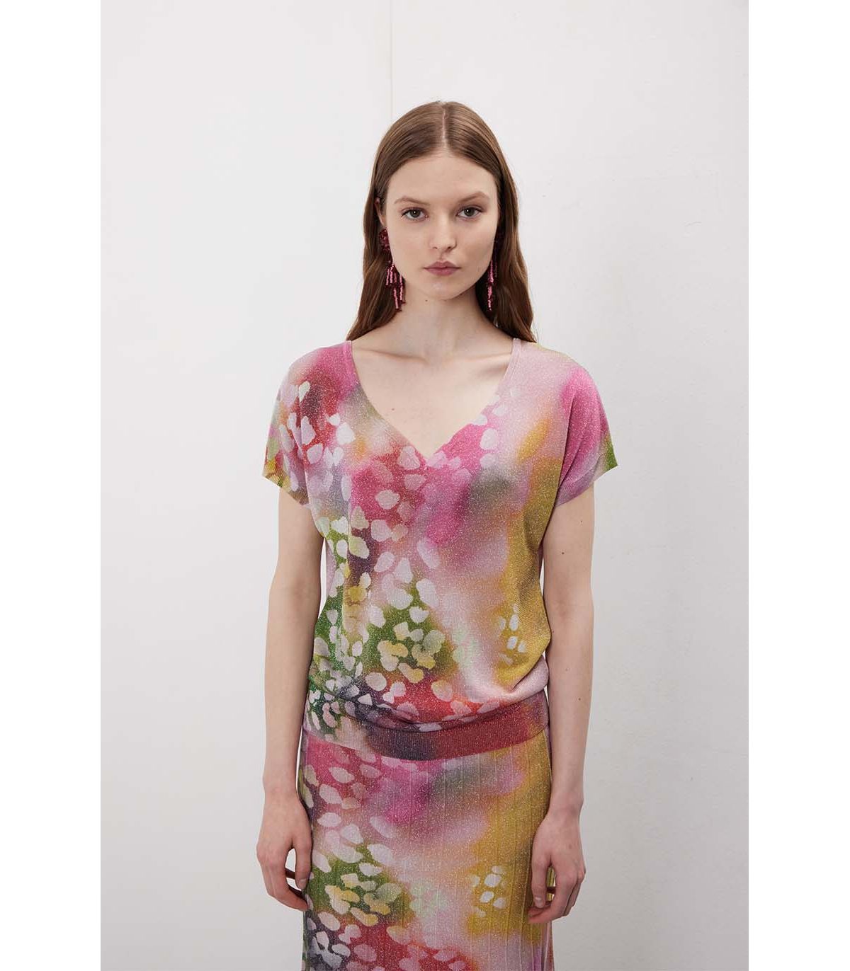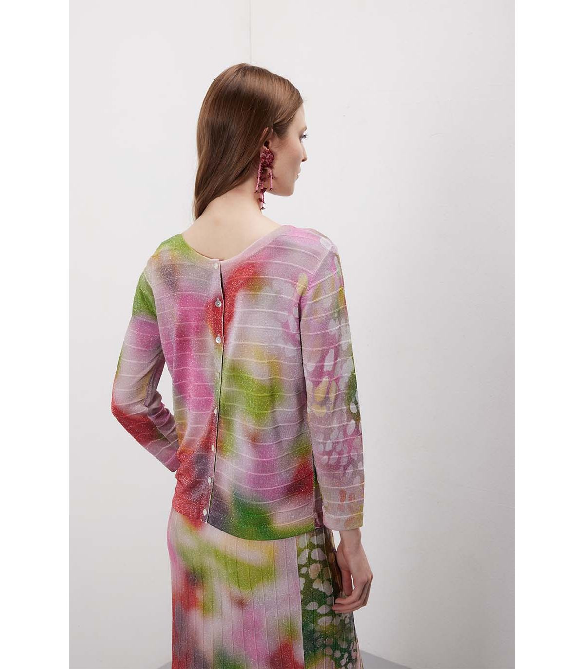 Sfumature che creano continuità tra i due pezzi, mentre il lurex aggiunge un punto luce raffinato. Indossato insieme è armonico, separato resta versatile e leggero. Linee fluide e proporzioni equilibrate per un look facile ma curato.