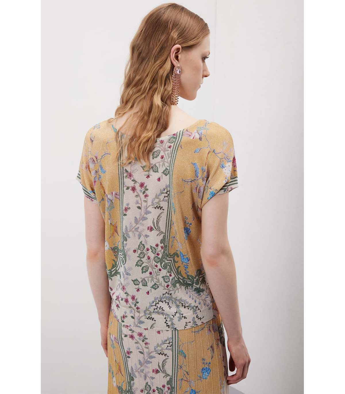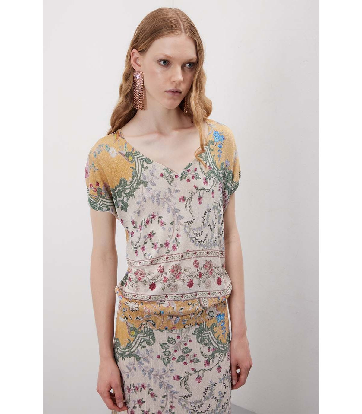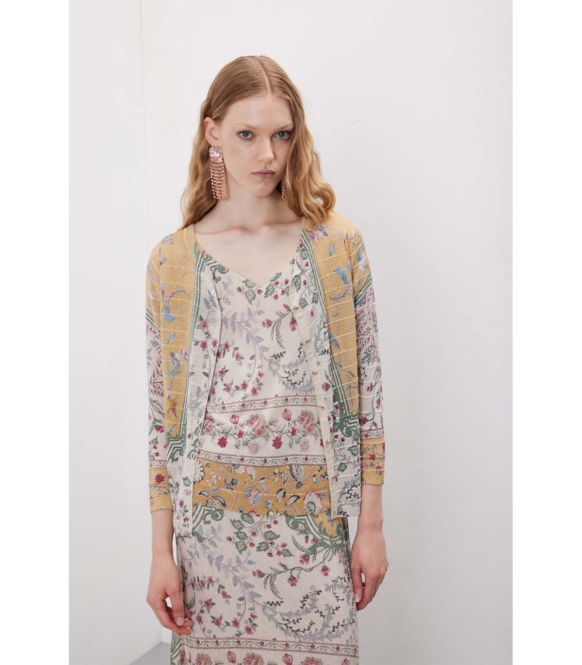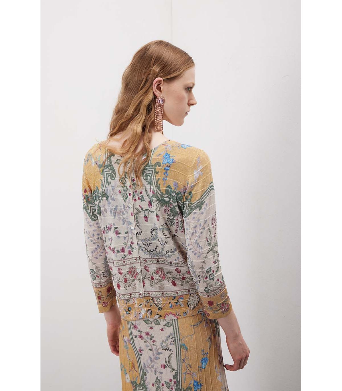 Motivo Wallpaper che crea continuità tra i due pezzi, mentre il filo lurex dona un punto luce sofisticato. Indossato insieme definisce un look completo e armonico, separato resta versatile e leggero. Linee fluide e costruzione equilibrata per uno stile rilassato e contemporaneo.