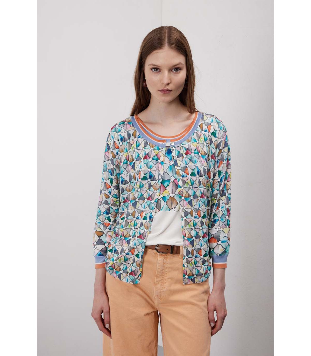 Coordinato composto da cardigan e maglia scollo V con stampa Graphic. Il pattern crea continuità visiva tra i due pezzi. Il filato pregiato con radice di liquirizia dona eleganza e profondità. Double use: entrambi i capi sono fronte e retro intercambiabili.